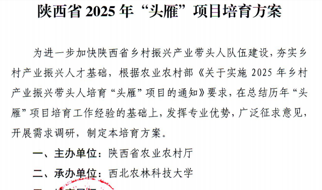 陕西省 2025 年乡村产业振兴带头人培育“头雁”项目培训班定在西北农林科技大学举办,采取“校内集中授课、线上学习、省外体验式教学、考察互访、导师帮扶”的模式,对带头人开展定制化、体验式、孵化型培育。培育分三期,每期三个阶段,痴农人参加的是第2期的第一阶段集中授课的方式。